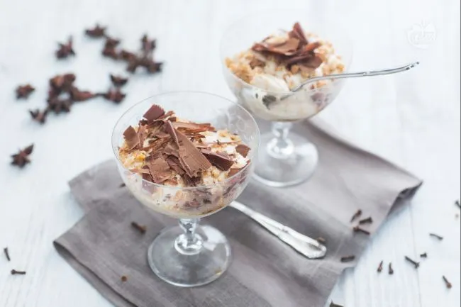 di un crumble tostato di frutta secca e biscotti, che regala una piacevole contrapposizione di morbido e croccante in ogni cucchiaio. Il mascarpone, addolcito con zucchero e yogurt, viene insaporito dal caffè e dal complesso bouquet speziato, creando una crema vellutata e profumata.