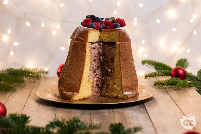 momento del taglio. La polvere di zucchero a velo ricorda la neve, mentre i frutti di bosco aggiungono una nota acidula e un tocco di colore vivace. La struttura porosa del pandoro si ammorbidisce leggermente a contatto con il gelato, assorbendone delicatamente il sapore senza perdere la sua caratteristica fragranza.