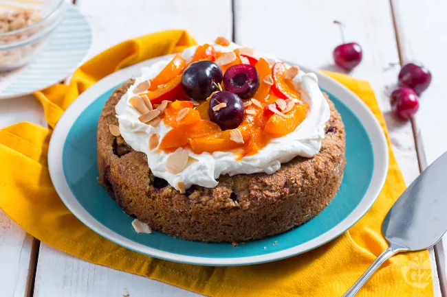 Questa torta rustica incarna il gusto dell'estate, con una base soffice e profumata di grano saraceno e mandorle che accoglie il succoso contrasto di frutta. La consistenza è morbida e granulosa, mentre il caramello delle albicocche e la freschezza della crema di yogurt creano un equilibrio perfetto tra dolcezza e acidità.