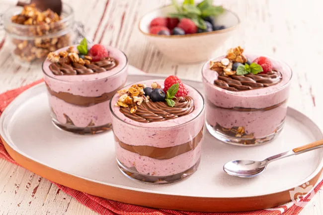 Un dessert al cucchiaio che conquista per l'equilibrio tra la cremosità vellutata dello yogurt e la croccantezza caramellata della granola fatta in casa. La freschezza dei frutti di bosco si fonde con la nota golosa della crema spalmabile, creando un contrasto di consistenze e sapori che rende ogni boccone un'esperienza completa.