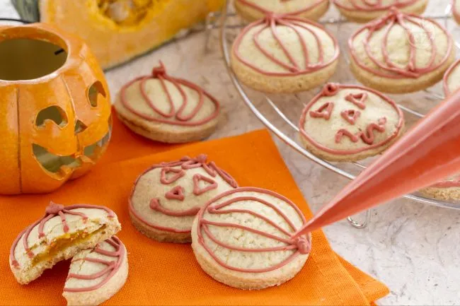 I biscotti di zucca della strega sono un dolce di Halloween che unisce la delicatezza della pasta frolla al sapore morbido e leggermente speziato di un ripieno di zucca. La loro forma chiusa e la decorazione con glassa arancione li rendono perfetti per creare un'atmosfera festosa, con la possibilità di personalizzare le faccine o i motivi in superficie.