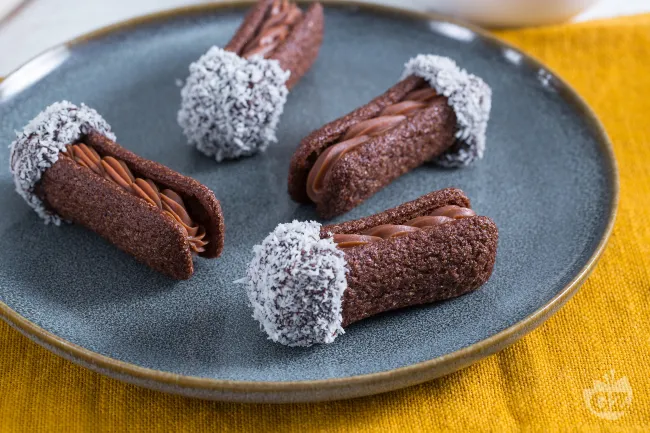 Un dessert raffinato che unisce la croccantezza del biscotto al cacao alla cremosità vellutata di una ganache al latte di cocco e cioccolato. La punta immersa nel cioccolato fondente e cocco rapè regala un contrasto di consistenze e un finale aromatico intenso. La ganache, preparata con cioccolato al latte e latte di cocco, sviluppa una texture liscia e un sapore tropicale che si sposa perfettamente con il cacao dei Pavesini.