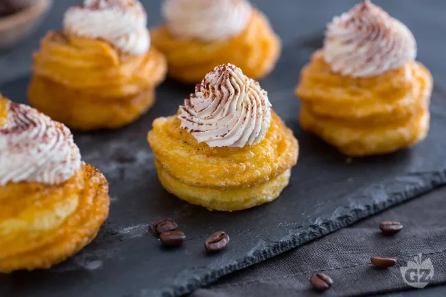 Le zeppole con crema al mascarpone e caffè sono una rivisitazione golosa e raffinata del classico dolce fritto. La pasta choux, leggera e croccante, si sposa con una crema vellutata e aromatica, dove l'intensità del caffè si fonde con la dolcezza del mascarpone, creando un contrasto di sapori elegante e sorprendente.