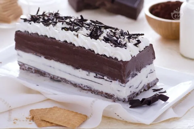 separate da sottili lastre di cioccolato croccante e poggiata su una base biscottosa. Il risultato è un dessert stratificato che offre un'esperienza sensoriale completa: dalla freschezza cremosa del gelato al contrasto tra la morbidezza delle preparazioni congelate e la friabilità della base.