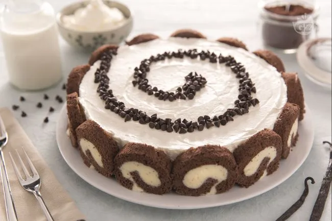 La cheesecake swiss roll è un dessert che unisce la cremosità di una cheesecake fredda alla delicatezza di un rotolo al cioccolato, creando un contrasto di consistenze e sapori elegante e invitante. La base croccante di biscotti al cioccolato sostiene una farcitura leggera e vellutata di formaggio fresco e ricotta, arricchita dalla vaniglia, mentre il perimetro è abbracciato da fettine sottili di swiss roll al cacao, che aggiungono un tocco visivo raffinato e una nota di intensità amara.
