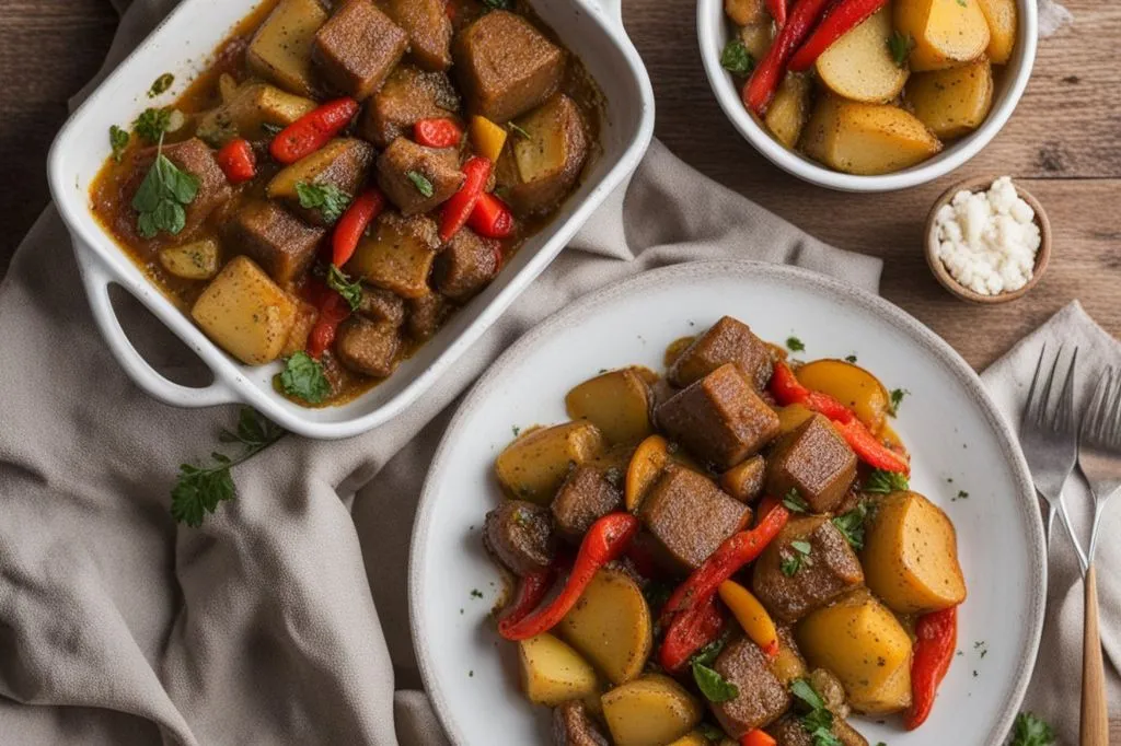 Un secondo piatto vegetale ricco e saporito, dove il seitan si fonde con la dolcezza dei peperoni e la consistenza tenera delle patate. La cottura in umido amalgama i sapori, creando un piatto rustico e confortevole, perfetto per un pasto sostanzioso ma leggero. Il peperone, cotto fino a diventare quasi cremoso, rilascia la sua dolcezza caratteristica, che si sposa con il gusto sapido dei capperi dissalati e la consistenza carnosa del seitan.