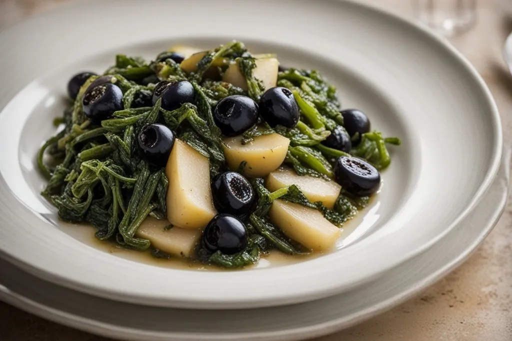 Lo scalogno stufato nell'olio extravergine dona una base aromatica dolce e profonda, che si fonde con la sapidità delle olive nere tagliate a rondelle. Il vino bianco, aggiunto a metà cottura, sfuma le note più aggressive della verdura, arrotondando il sapore con una vena fresca e fruttata.