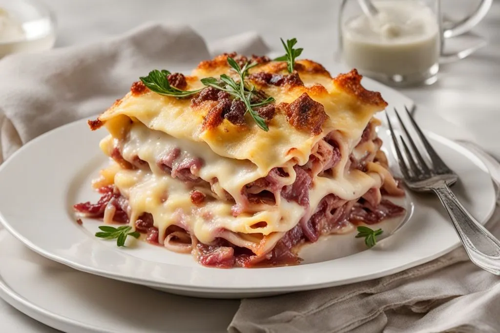 speck e la cremosità di due formaggi, il tutto racchiuso tra strati di pasta e una generosa besciamella. Il risultato è un piatto ricco, dal sapore deciso ma equilibrato, dove l'amaro gentile del radicchio dialoga perfettamente con la grassezza degli affettati e la morbidezza dei latticini.