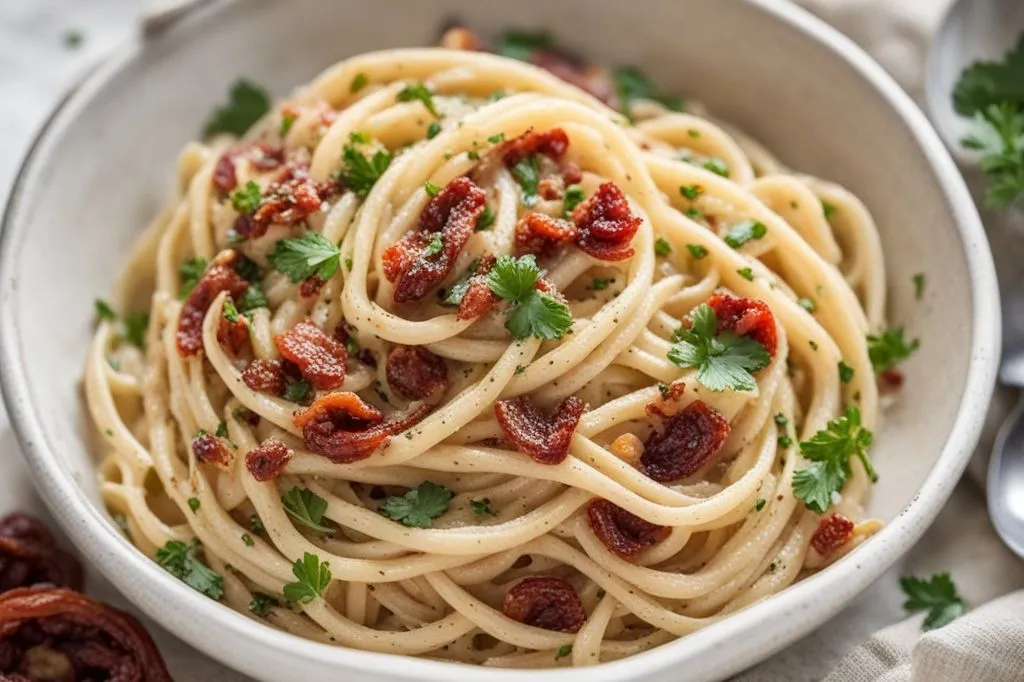 Una pasta dal sapore rustico e avvolgente, dove la tecnica della risottatura regala alle linguine una consistenza cremosa e perfettamente legata al sugo. Il risultato è un piatto ricco di sapori profondi, che unisce la sapidità della pancetta affumicata all'intensità dolce-acidula del pomodoro secco, con una nota finale di vino rosso che arrotonda il tutto.