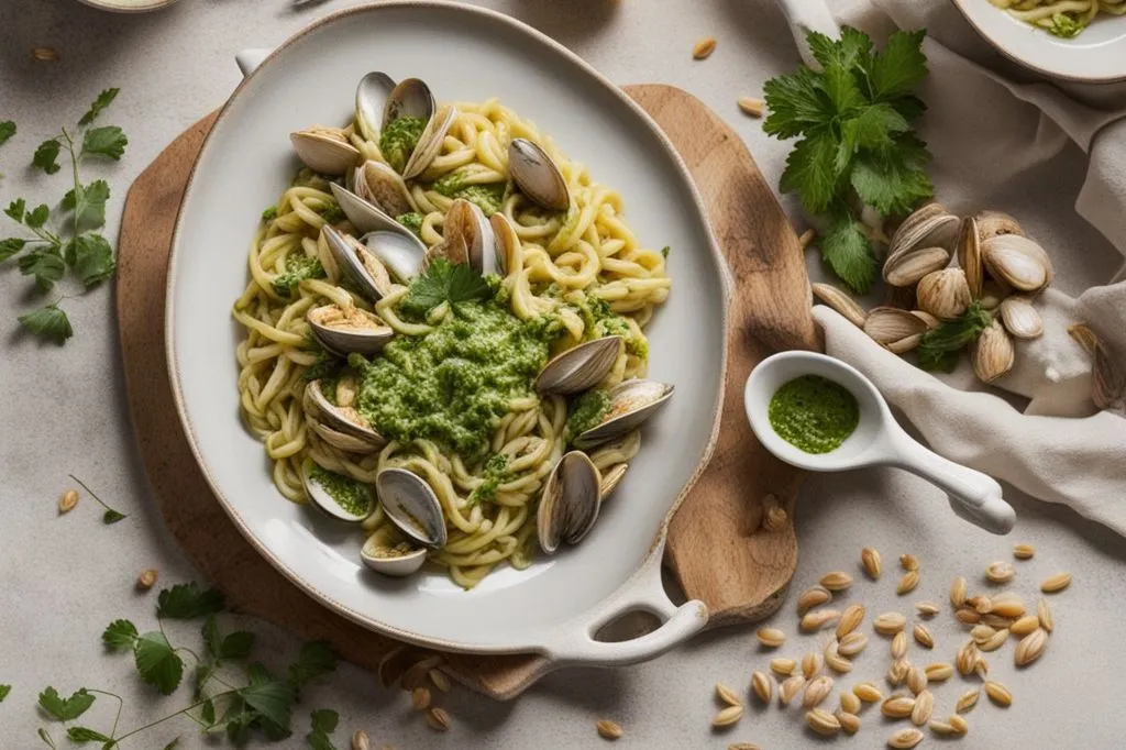 Le vongole, aperte in un soffritto di aglio e prezzemolo e sfumate con vino bianco, rilasciano la loro sapidità, bilanciando la cremosità con una nota fresca e marina. Piatto ideale per una cena informale ma di carattere, si prepara in pochi minuti e conquista per l'equilibrio tra l'intensità del pesto, la dolcezza dei molluschi e la consistenza al dente della pasta.