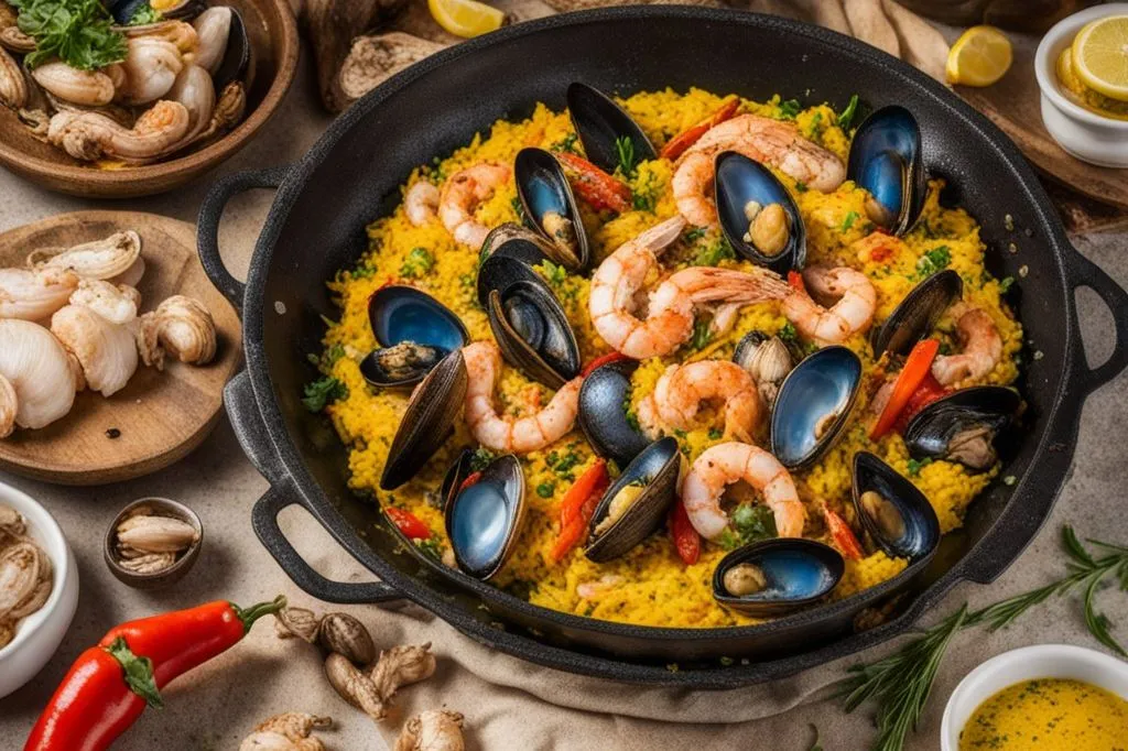 Il misto di cozze, vongole, calamari, gamberi e scampi offre un contrasto di consistenze tra la tenerezza dei molluschi e la croccantezza dei crostacei. I peperoni gialli e rossi, cotti al vapore, mantengono una nota dolce e fresca che bilancia la sapidità del mare, mentre lo zafferano infonde il suo caratteristico colore dorato e un aroma terroso e prezioso.