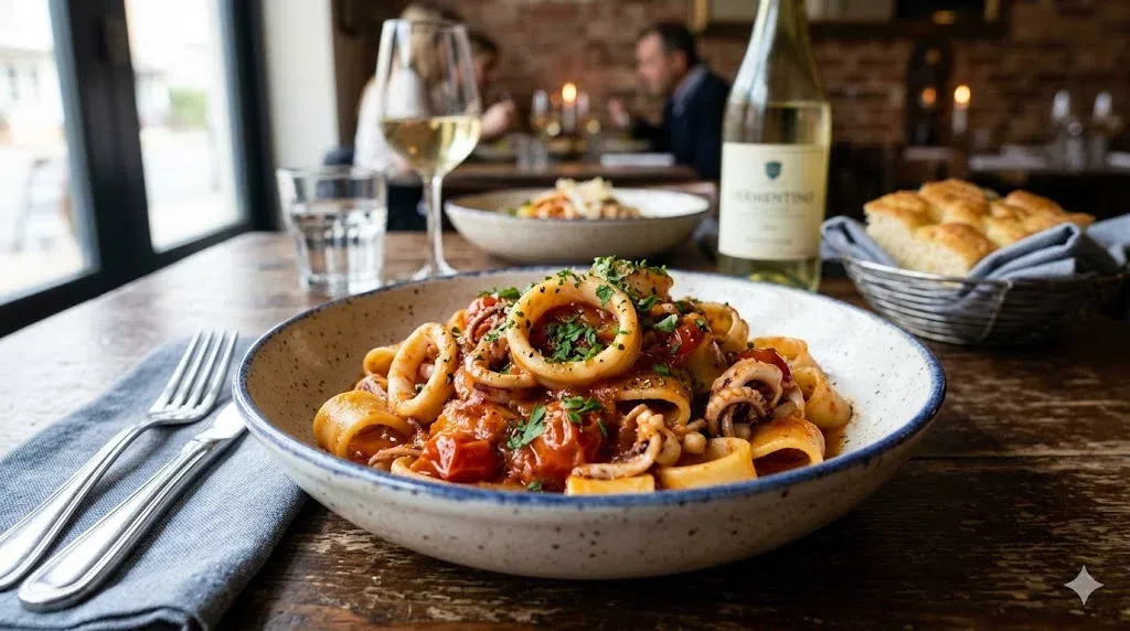 il sugo ricco e saporito, creando un'esperienza gustativa dove il dolce dei pomodorini si fonde con il carattere deciso del frutto di mare. Ogni boccone regala la consistenza tenera dei calamari e il profumo intenso dell'aglio e del prezzemolo fresco.