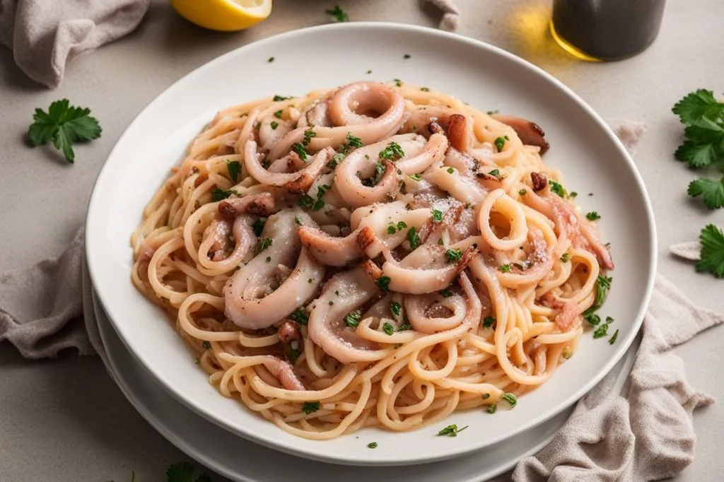Un primo piatto che unisce la consistenza morbida e saporita del polipo alla cremosità di una cottura risottata, dove le linguine assorbono tutto il gusto del mare. La tecnica di cottura permette alla pasta di rilasciare amido, creando una salsa vellutata che avvolge ogni ingrediente con eleganza. Il polipo, cotto a lungo, diventa tenero e mantiene un piacevole contrasto con la pasta al dente, mentre l'aglio e l'olio extravergine regalano un fondo aromatico profumato.