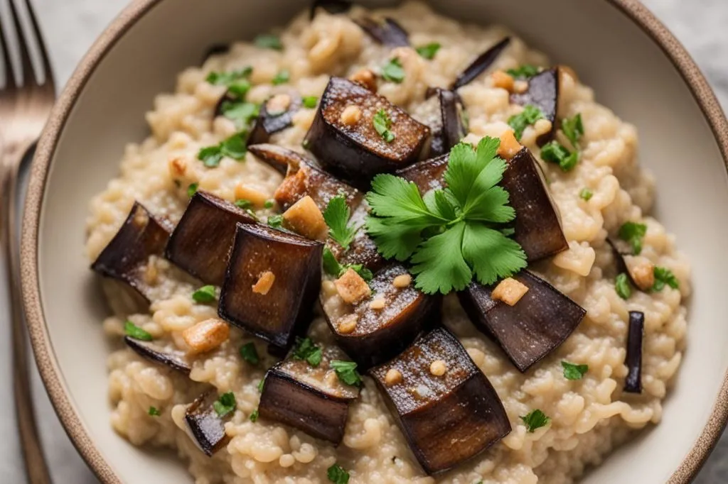 Un risotto che conquista per la sua cremosità avvolgente e il sapore intenso e terroso delle melanzane. La cottura lenta permette al riso di rilasciare tutto il suo amido, creando una consistenza vellutata che si sposa perfettamente con i tocchetti di verdura, leggermente caramellati e morbidi. L'aglio, appena sfumato, regala un profumo delicato che non copre ma esalta la protagonista.