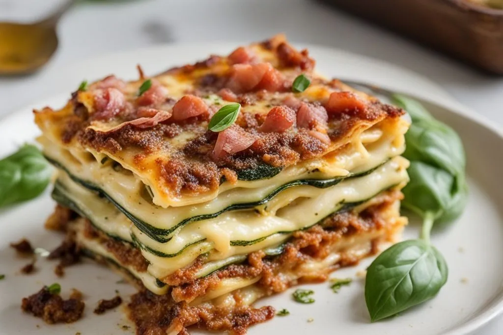 Una rivisitazione leggera e profumata della lasagna classica, dove la cremosità del pesto di zucchine si sposa con la sapidità della pancetta croccante. Il risultato è un piatto ricco di sapore ma dall’impatto più fresco, perfetto per chi cerca un primo piatto sostanzioso ma non pesante. Le zucchine, cotte al vapore e poi trasformate in un pesto cremoso con mandorle tostate e parmigiano, regalano una nota erbacea e delicata.