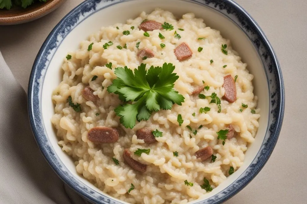 La salsiccia luganega, sbriciolata e rosolata, rilascia i suoi aromi intensi e le sue note leggermente speziate, fondendosi perfettamente con il fondo di cipolla stufata. Il riso carnaroli, cotto al punto giusto, mantiene una piacevole resistenza al centro pur assorbendo il sapore del brodo vegetale, creando un equilibrio tra struttura e cremosità.