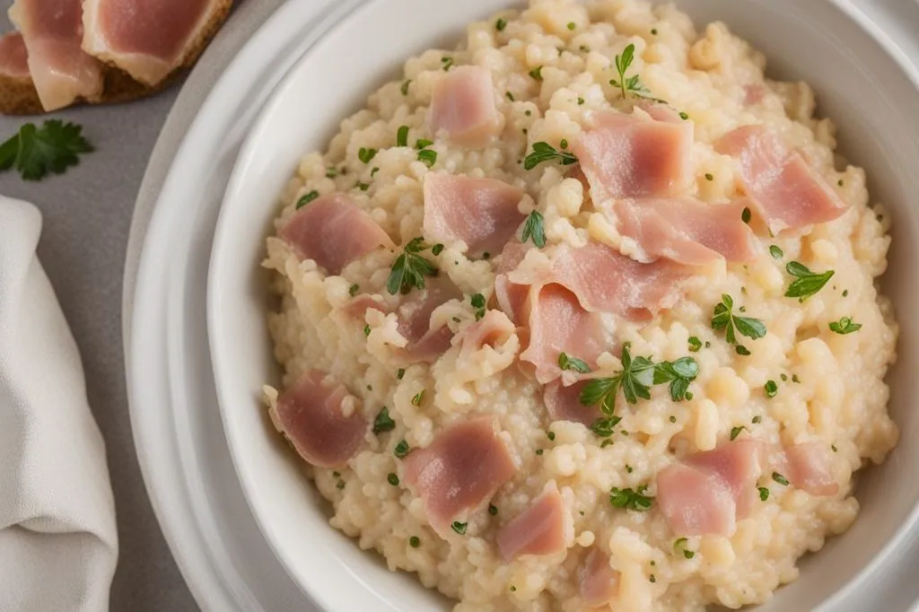 Lo scalogno, tritato finemente, offre una base aromatica delicata e leggermente dolce, mentre il prosciutto cotto, tagliato a cubetti, regala note salate e una piacevole consistenza. Il parmigiano, mantecato a fuoco spento, aggiunge un tocco di sapidità complessa e completa il profilo gustativo con la sua nota umami.