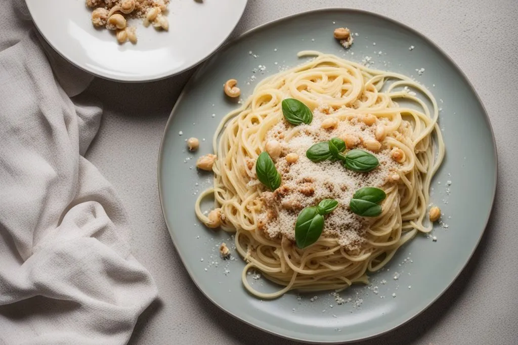 spaghetti, creando un equilibrio tra il sapore dolce e terroso della verdura e le note sapide dell'acciuga e del parmigiano. La granella di nocciole tostate aggiunge un contrasto di texture fondamentale, mentre il basilico fresco dona una nota erbacea che alleggerisce l'insieme.