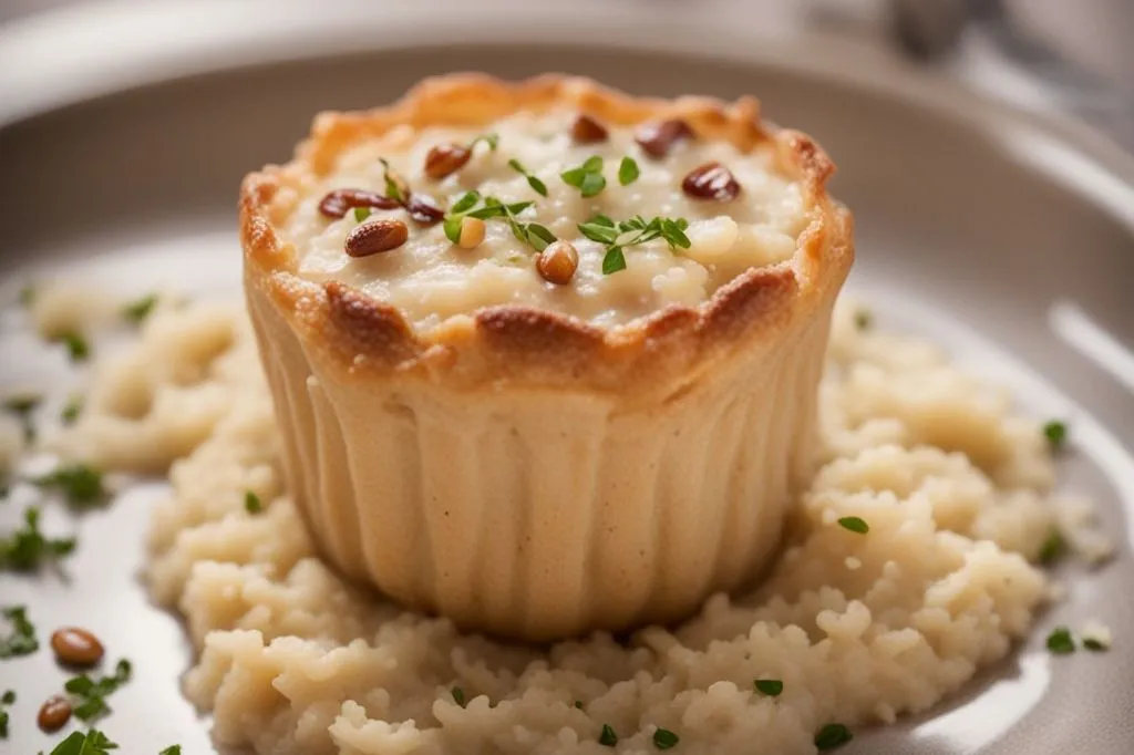 della tavola, racchiudendo in una fragile cupola di pasta sfoglia l'anima cremosa di un risotto che canta di boschi e focolari. Ogni forchetta che rompe la crosta dorata libera un vortice di aromi terrosi e burrosi, anticipando la fusione perfetta tra la dolcezza carnosa delle castagne e la sapidità vibrante del pecorino.