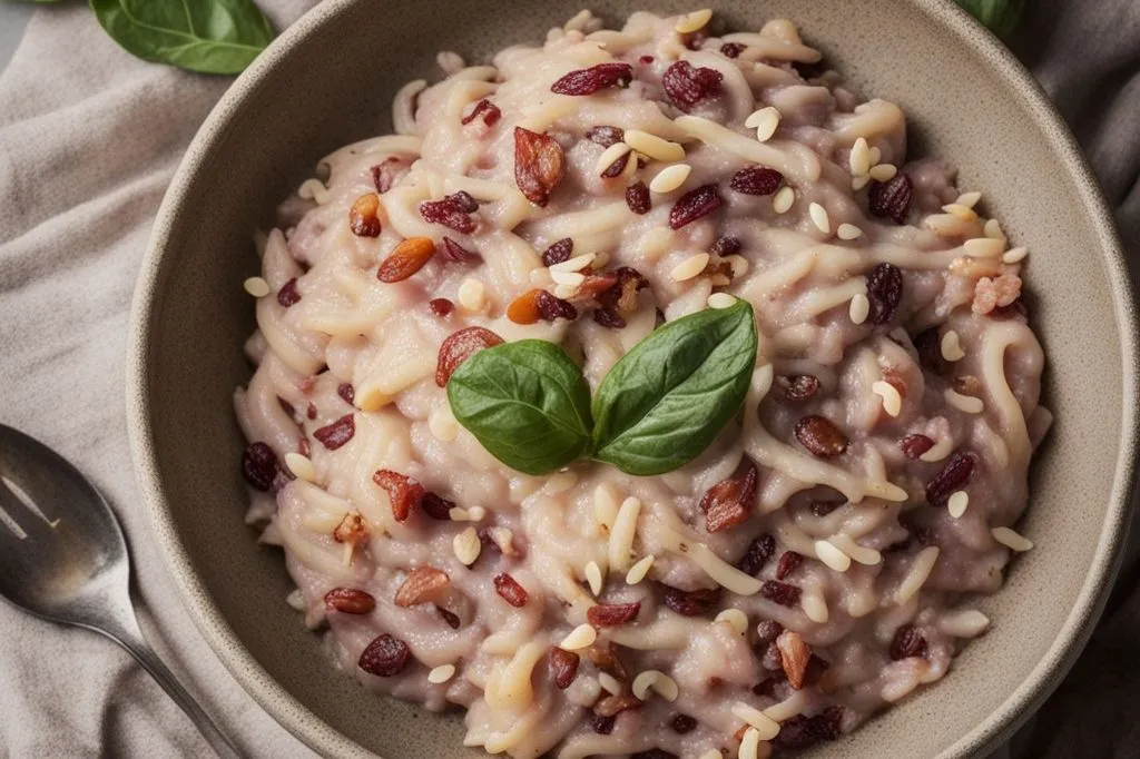 Un risotto che unisce l'amaro elegante del radicchio tardivo alla sapidità avvolgente della pancetta, per un primo piatto dal carattere deciso e dalla cremosità perfetta. La mantecatura finale con burro e parmigiano regala una consistenza vellutata che avvolge ogni chicco, mentre le noci tritate aggiungono una piacevole nota croccante e tostata.