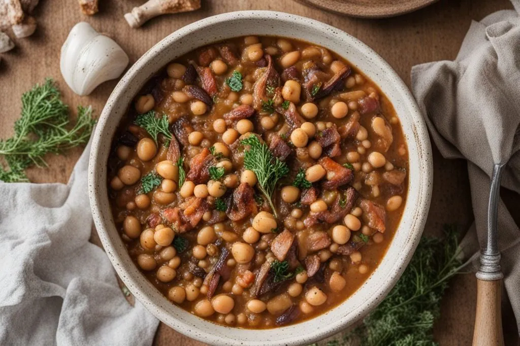 I fagioli borlotti e i ceci precotti, protagonisti indiscussi, si ammorbidiscono ulteriormente durante la cottura, rilasciando la loro amido e addensando naturalmente il brodo. La pancetta affumicata, rosolata nel soffritto, dona una nota salata e carnosa che si lega al peperoncino, regalando un finale lievemente piccante. I funghi porcini, reidratati, infondono tutta la loro potenza selvatica, creando un contrasto intrigante con la dolcezza delle carote.
