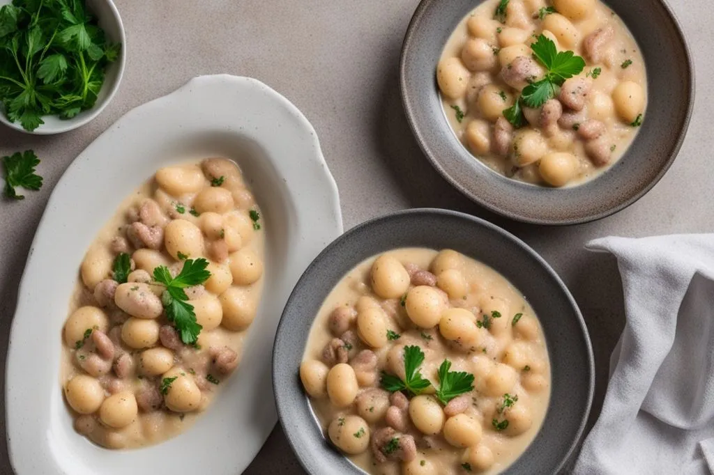 morbida e compatta, si sposano con un sugo ricco di fagioli borlotti e il profondo aroma del lardo, creando un primo piatto dal carattere deciso e avvolgente. È un'esperienza che unisce la semplicità degli ingredienti a una complessità di sapori autentici.