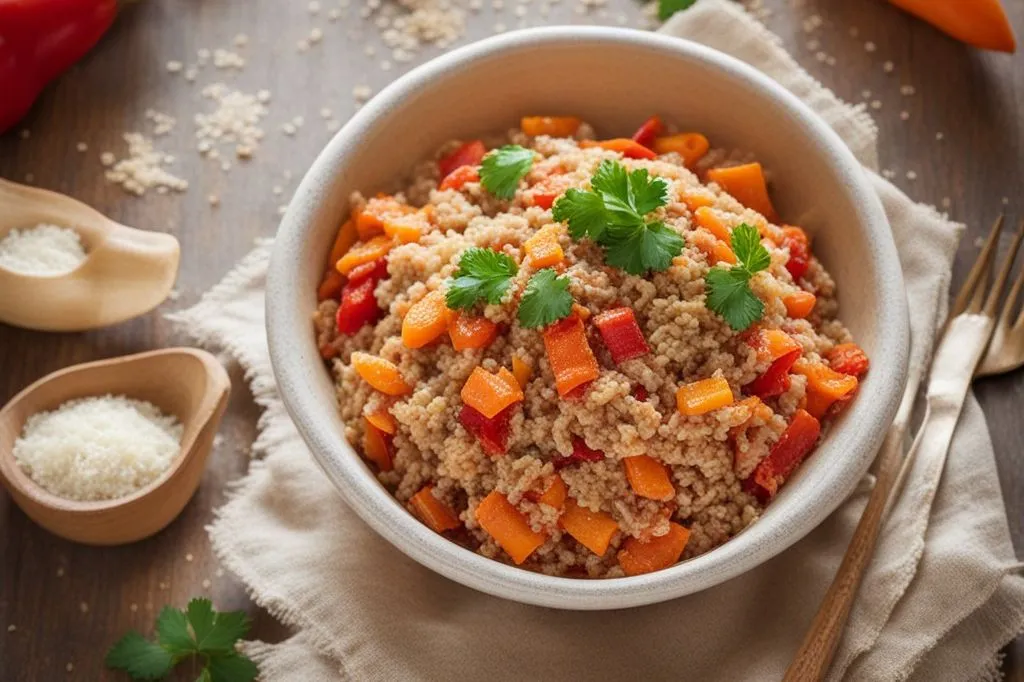 riso integrale, avena e grano si sposa perfettamente con i peperoni e le carote stufati, che rilasciano la loro naturale dolcezza durante la cottura lenta.