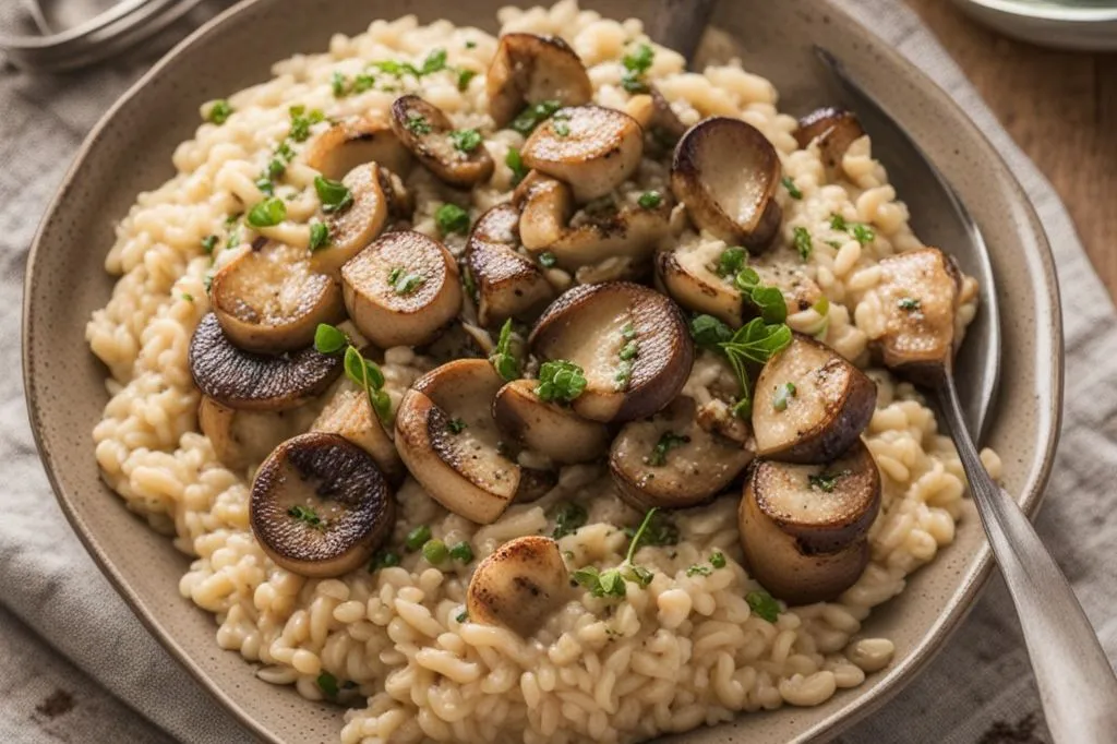 Un risotto vegano che unisce la cremosità classica del riso mantecato con il sapore terroso dei funghi pioppini e la consistenza sapida del tofu affumicato. La preparazione sfrutta la tecnica della tostatura del riso e la lenta aggiunta di liquido per ottenere una consistenza vellutata e avvolgente, dove ogni chicco rimane ben distinto ma perfettamente amalgamato al condimento. I pioppini, dal profumo intenso e leggermente legnoso, rilasciano il loro succo durante la cottura, creando un fondo di sapore profondo che viene esaltato dal vino bianco.