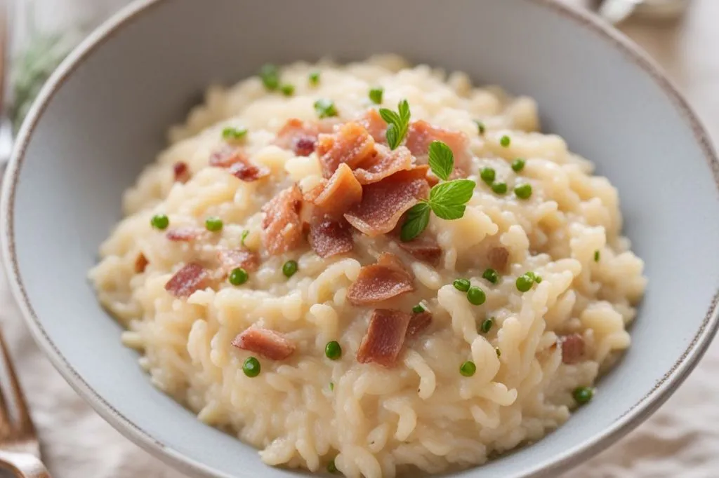consistenza vellutata e irresistibile. La pancetta croccante, saltata in padella con un tocco d'aglio, aggiunge note affumicate e salate che si sposano perfettamente con la delicatezza del riso. Il contrasto tra la cremosità del risotto e la croccantezza della pancetta è l'elemento distintivo di questa preparazione, mentre il pepe nero macinato al momento completa il profilo aromatico con una punta piccante.