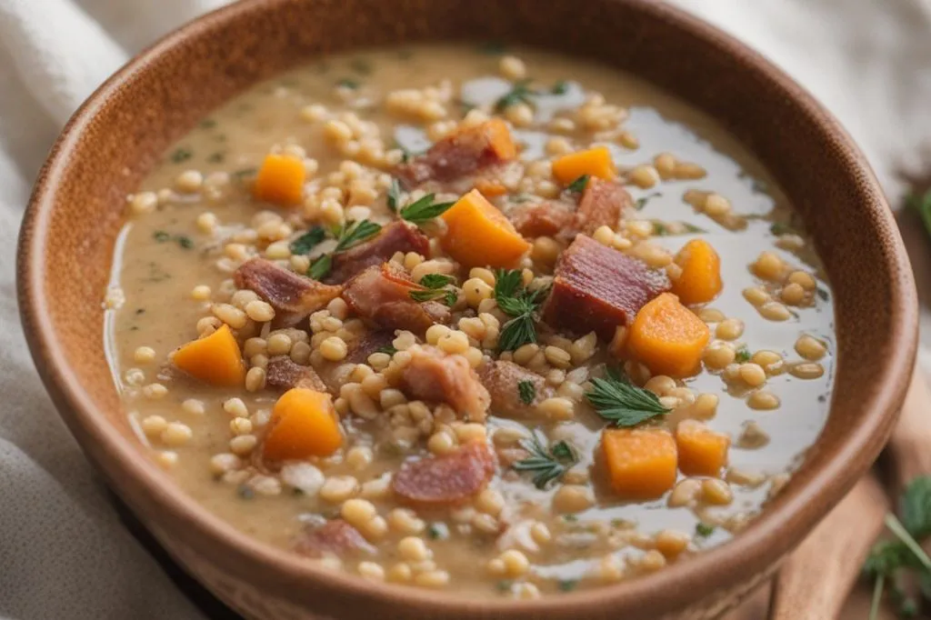 La zucca, cotta fino a diventare quasi una purea, regala una base vellutata e naturalmente dolce, mentre i cubetti di speck, leggermente croccanti ai bordi, rilasciano il loro grasso aromatico insaporendo il tutto. I cereali, che possono variare tra orzo, farro o grano saraceno, assorbono i profumi e mantengono una piacevole consistenza al dente, offrendo un contrasto di texture.