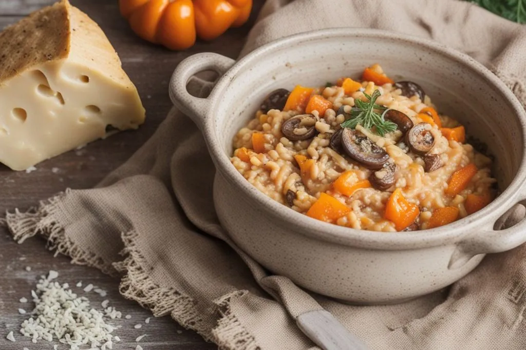 La zucca dona una dolcezza naturale e una consistenza vellutata, mentre i funghi porcini a fette regalano un intenso aroma boschivo e una piacevole consistenza carnosa. Le note aromatiche dell'alloro e la sapidità delle olive nere bilanciano il piatto, creando un contrasto armonioso che si completa con la grattugiata finale di Grana Padano, che si scioglie lentamente formando una cremosa patina.