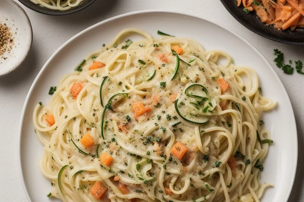 La cremosità della salsa, ottenuta dalla mantecatura dell'uovo e del latte con il parmigiano, avvolge perfettamente gli spaghetti al dente, mentre le verdure tagliate finemente regalano una piacevole consistenza e un tocco di colore. Il pepe nero, aggiunto a crudo, completa il piatto con la sua nota piccante e aromatica, richiamando il profilo originale della carbonara.