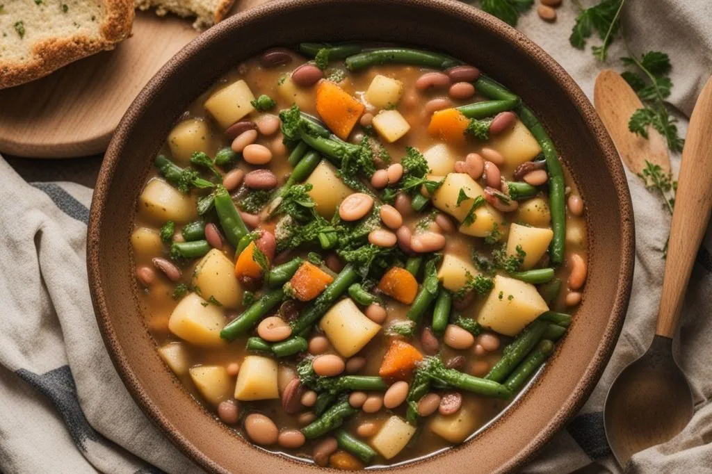 La magia risiede nei contrasti sapientemente bilanciati: la dolcezza carnosa delle patate che si sfalda contro la freschezza croccante dei fagiolini, mentre la cremosità vellutata dei borlotti, cotti fino a sfaldarsi leggermente, addensa il brodo donandogli corpo. Il tutto è tenuto insieme da un soffritto profumato, dove la cipolla caramellata dialoga con le note terrose della salvia e la punta delicata dell'alloro, creando un fondo aromatico di straordinaria complessità. Perfetto per una serata invernale, questo minestrone si offre come piatto unico che unisce sostanza e leggerezza. La sua preparazione semplice e meditativa si trasforma in un gesto d'amore che nutre e riscalda, coronando una cena informale con un senso di appagamento genuino.
