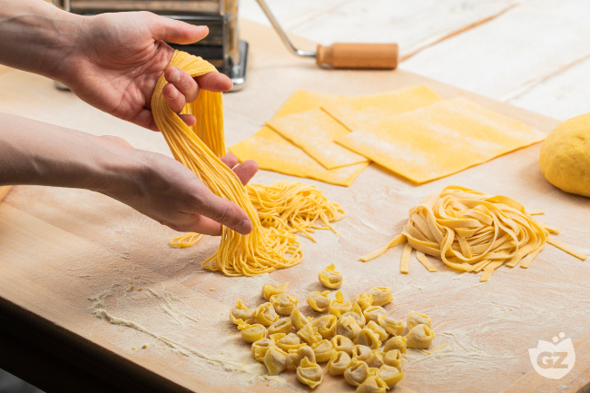 Una sfoglia di pasta all'uovo che si presenta con un colore giallo dorato intenso, segno della qualità delle uova utilizzate. Al tatto risulta liscia, elastica e vellutata, pronta per essere tirata in fogli sottili e traslucidi. Quando cotta, emana un profumo rustico e invitante di grano e uova fresche, con una consistenza che offre la perfetta resistenza al dente, capace di trattenere sughi e condimenti in modo impeccabile. Ogni formato, dalle tagliatelle alle pappardelle, diventa il veicolo ideale per esaltare i sapori della tradizione.