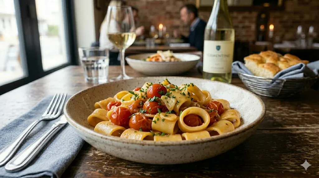 La magia risiede nei contrasti sapientemente bilanciati: la tenerezza quasi burrosa dei calamari, cotti al punto giusto per preservarne la delicatezza, dialoga con l'esplosione acidula e zuccherina dei datterini appena scoppiati in padella. Il tutto è tenuto insieme dall'oro dell'olio extravergine, che trasporta il calore aromatico dell'aglio dorato e la punta vibrante del peperoncino fresco, mentre il prezzemolo e il basilico regalano note finali di freschezza erbacea.