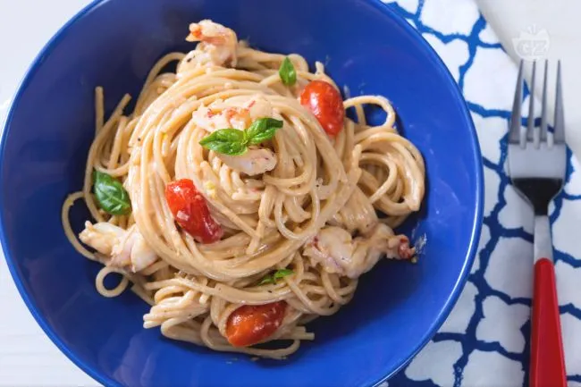 la dolcezza succulenta dei gamberi si fonde con la freschezza agrumata, creando un primo dal carattere deciso ma raffinato, capace di trasformare una cena veloce in un momento di genuino piacere.