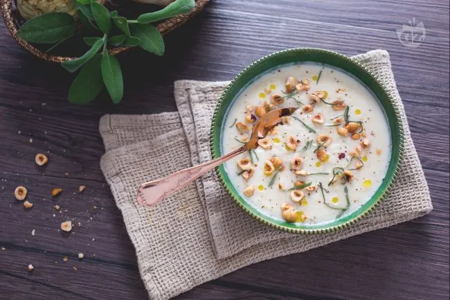 La dolcezza delicata e terrosa del sedano rapa, esaltata dalla dolcezza più sottile del porro, trova il suo perfetto contrappunto nel calore aromatico della salvia fresca e nel croccante deciso delle nocciole tostate. Ogni cucchiaiata è un dialogo tra la vellutata setosità della panna, la punta pepata e il finale caldo della noce moscata, con l'olio extravergine a legare il tutto con un filo d'oro fruttato.