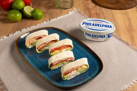 Stendi le piadine, farciscile con salmone, avocado, pomodoro e crema di formaggio. Arrotola, stringi e taglia a fette.